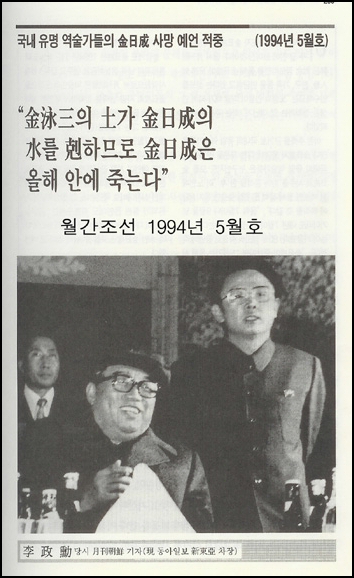 그로부터 15년 후인 1994(甲戌)년 4월 당시 월간조선에서 특종기사를 문의해와 금년 한로(寒露) 상강(霜降)절기 즉 9월 이전에 북의 김일성이 사망할 것 이라고 단언 했습니다.