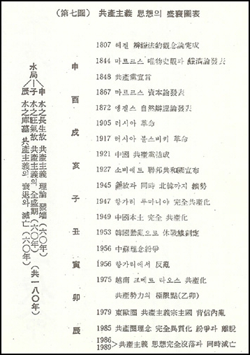우선은 본인이 1978년 역우지에 "미래세계와 한국의 사명"이라는 주제하에 공산주의 사상의 종말을 과학적으로 계산하여 그 도표(圖表)를 발표한 바 있습니다.