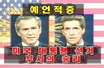 선거결과가 발표된 11월 4일 도쿄TV 출연중 부시의 당선소식을 접하게 되었으며 선거인단 확보수에서 서울 인터뷰 때 예언한 그대로 정확히 9포인트가 앞선 가운데 부시 당선의 확정을 알게 되었습니다.